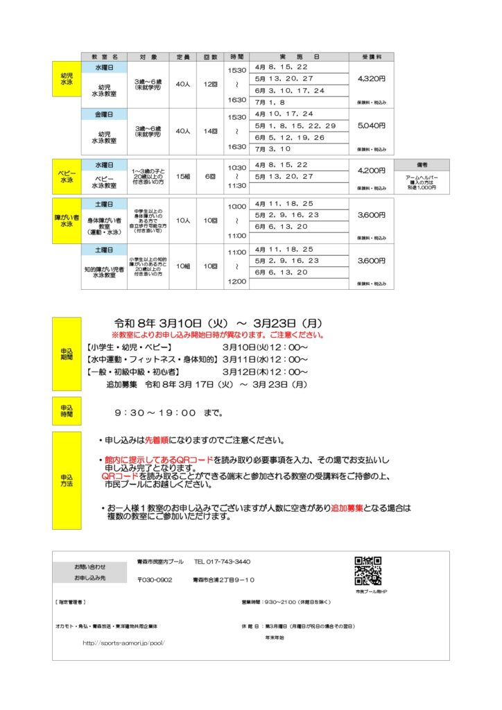 令和8年度第1期水泳教室募集要項 2026 3/03 お知らせ いつも青森市民室内プールをご利用いただきありがとうございます。 令和8年度第1期水泳教室の募集要項を掲載いたします。 皆様のご参加、心よりお待ちいたしております。 お知らせ 水泳教室の振替日のご案内 関連記事 水泳教室の振替日のご案内 2026年3月2日 芳形コーチのマンツーマンレッスン・3月 2026年3月1日 体育教室無料体験会申し込み 2026年3月1日 令和8年3月利用予定表(3月1日更新) 2026年2月20日 スマートウォッチの使用について 2026年2月6日 利用規約が7月18日より一部変更になります 2025年7月11日 スイミングコーチ募集 2023年6月22日